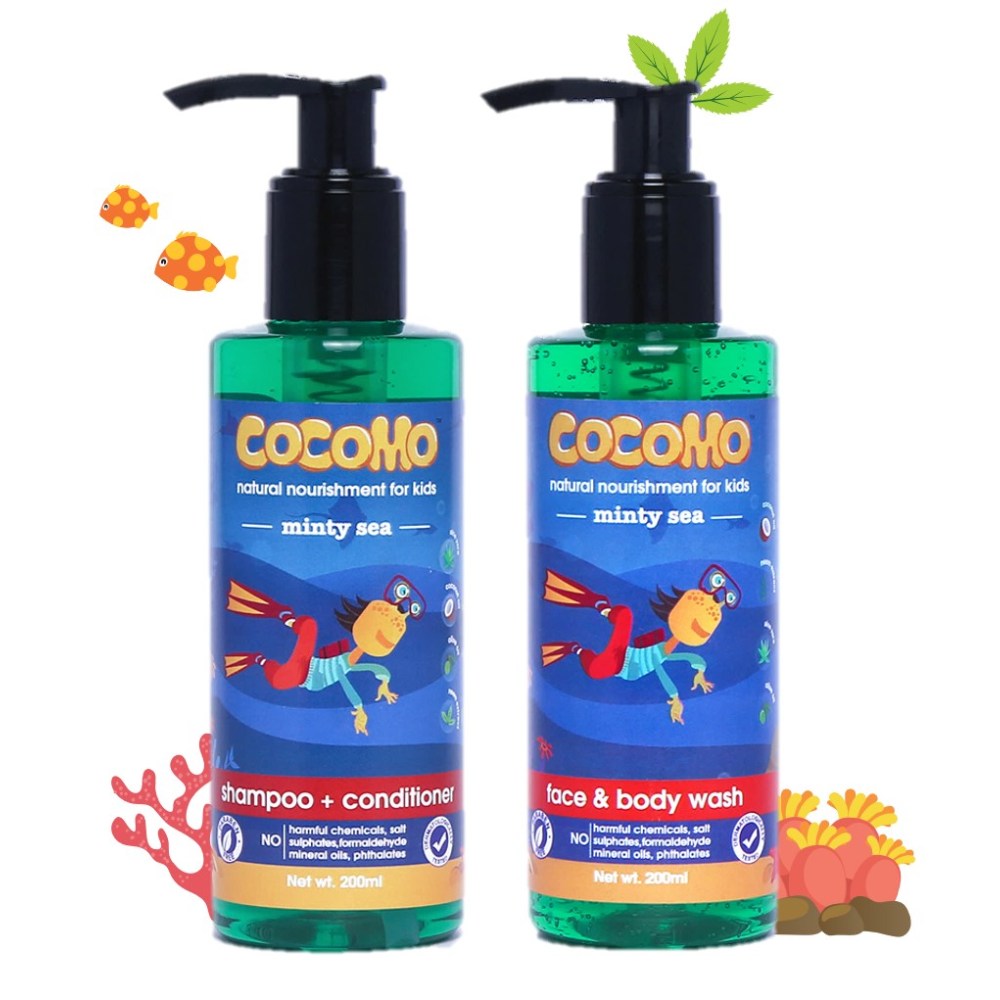 Cocomo Minty Sea Shampoo + Body Wash combo pack makes your child's bath time experience refreshing and pleasant by gently cleansing & conditioning your child’s sensitive skin & hair.
